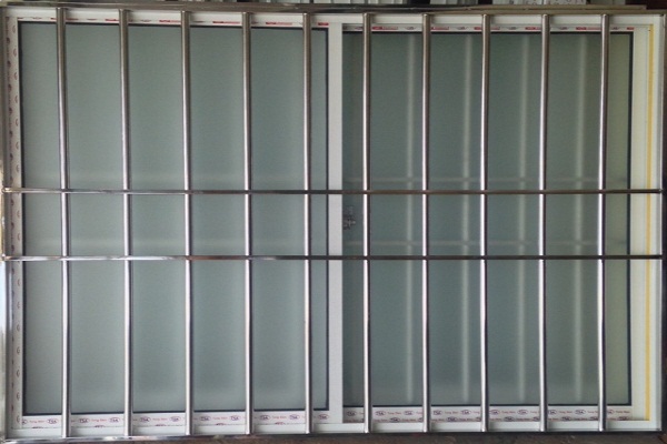Cửa đi 4 cánh hệ 1000 nhôm tungshin dày loại 1 chia ô kính 8 ly mài cạnh giá: 1.800.000đ/1m2